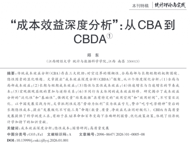 我校讲席教授、统计与数据科学学院名誉院长邱东教授的学术论文《“成本效益深度分析”:从CBA到CBDA》在《统计理论与实践》2026年第1期以“本刊特稿”形式发表。