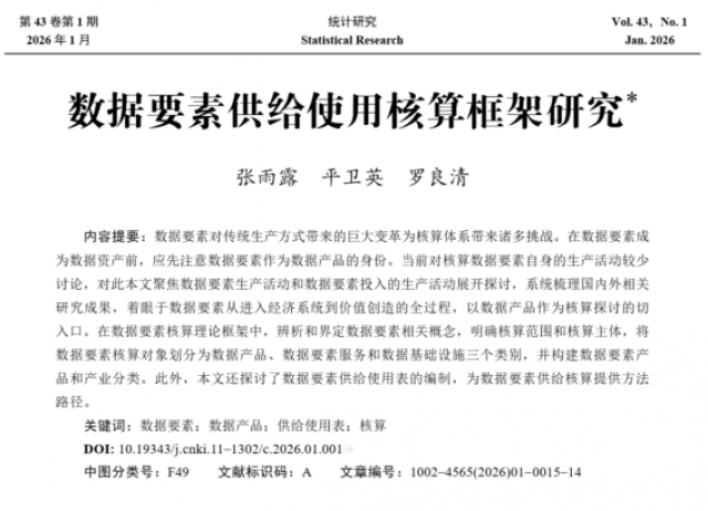近日,统计与数据科学学院、超越 GDP 研究院青年教师张雨露博士联合南昌大学平卫英教授及我院罗良清教授共同完成的研究成果 《数据要素供给使用核算框架研究》,成功刊发于国内统计学领域顶刊《统计研究》2026 年第1期。